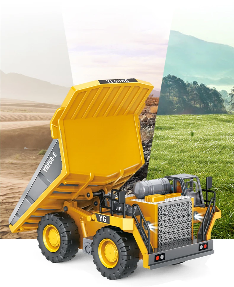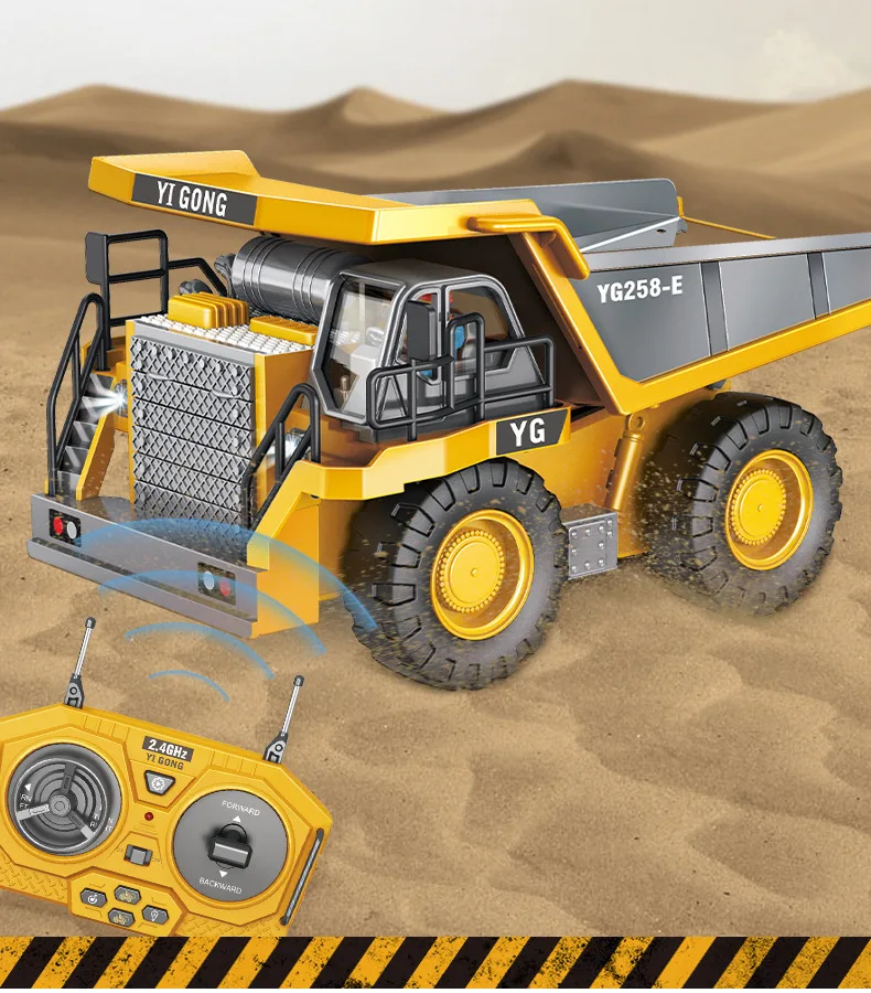 O modelo conta com tração robusta e estrutura fiel a um caminhão basculante real. As luzes e sons podem ser ativados e desativados diretamente pelo controle remoto. Produzido na escala 1/20, é um veículo de engenharia altamente realista, produzido com materiais de qualidade, incluindo partes metálicas reforçadas, assim, garantindo durabilidade e capacidade para suportar certo peso.