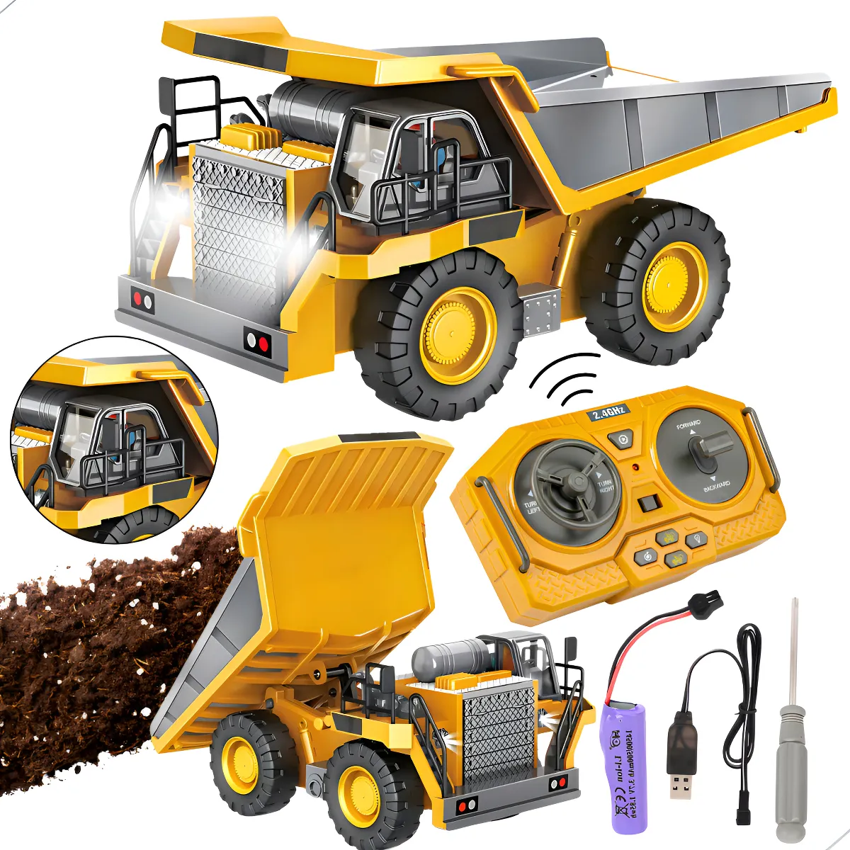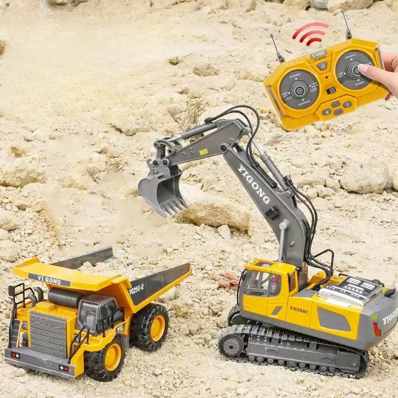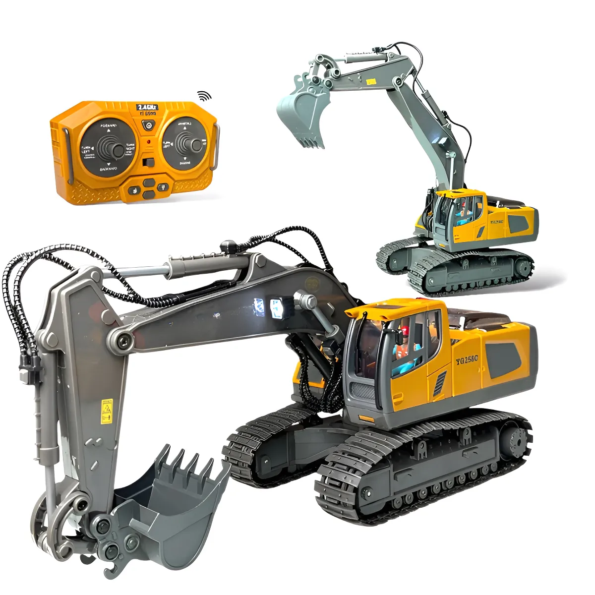 • Kit com 2 veículos de engenharia controlados por controle remoto — Escavadeira + Caminhão Basculante — completos, realistas, com luzes, sons e peças reforçadas.